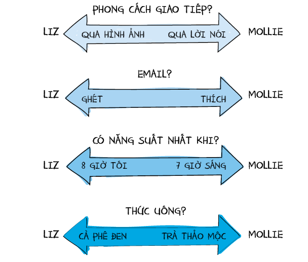 Khi chúng tôi gặp nhau, sự hứng thú chung của cả hai về những cách ảnh hưởng của cảm xúc lên công việc đã thôi thúc chúng tôi cùng soạn thảo những bài báo có kèm hình minh họa về chủ đề này. Nhưng chúng tôi nhanh chóng vấp phải rào cản khó nhằn: Trước đây chúng tôi chưa từng làm việc trực tiếp với nhau, điều đó dẫn đến việc giao tiếp kém hiệu quả. Mollie cảm thấy Liz bị ám ảnh bởi những chi tiết vụn vặt mà chẳng ai thèm để ý, trong khi Liz lại thấy rằng Mollie làm việc quá hấp tấp. Những bức email chúng tôi gửi cho nhau ngày một căng thẳng hơn và dự án của cả hai sớm phải dừng lại. Với mong muốn cứu vãn tình bạn và sự hợp tác, chúng tôi đã hẹn nhau ăn tối để thẳng thắn bàn về những vấn đề giữa hai bên.